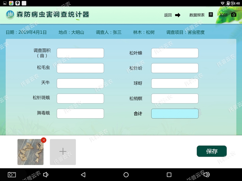 ●現場采集:工作人員可以在調查病蟲害的時候可以現場采集工作照、林木照等